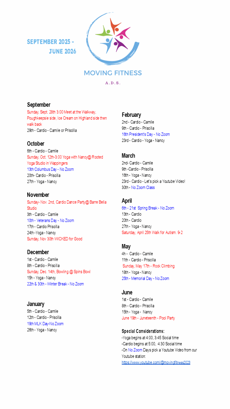 - Recorded classes can be found on our YouTube channel at Moving Fitness, Autism Directory Service, Inc.: https://www.youtube.com/@movingfitness2023